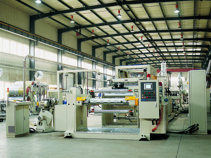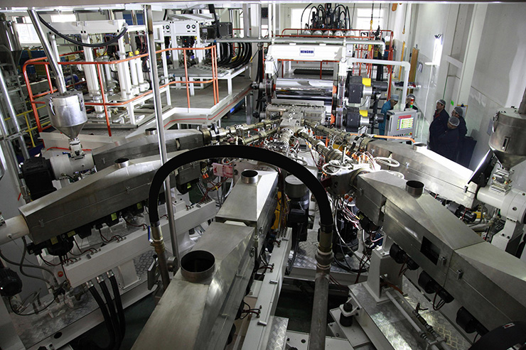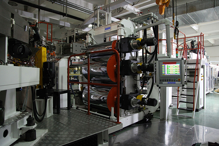 該類生產(chǎn)線用于擠出生產(chǎn)復(fù)合的功能性片材,如五層或七層PP阻隔片材,用于食品保鮮包裝容器;三層PS導(dǎo)電片材,用于電子包裝;四層PS片材,用于酸奶包裝。